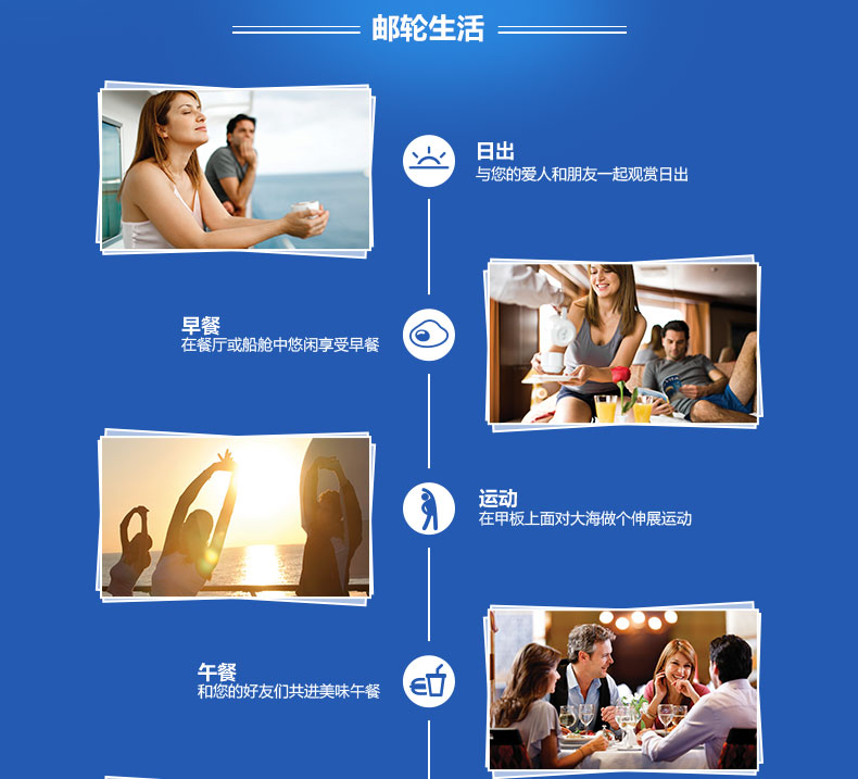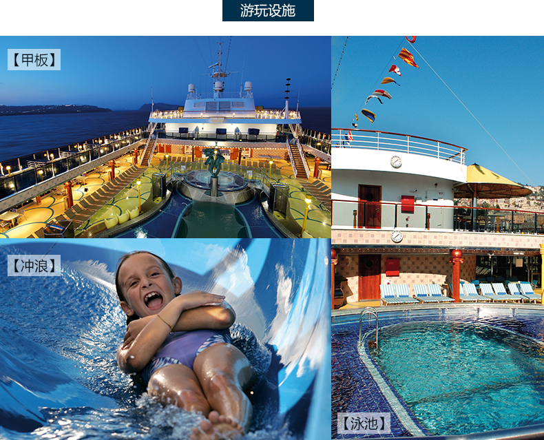 3、免费享用指定的船上设施、场所,免费观看、参加指定的娱乐节目及活动(健身房、游泳池、按摩池、娱乐音乐表演、儿童与青少年在船上的游戏和各种免费参与的娱乐项目);