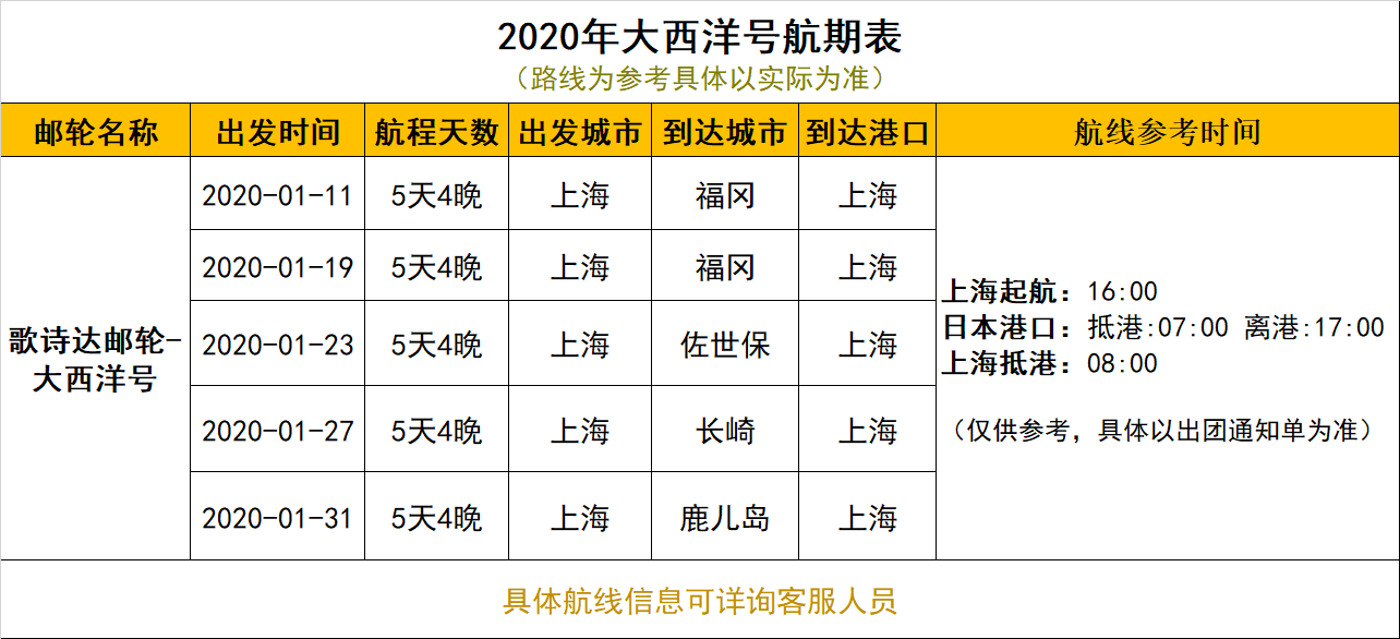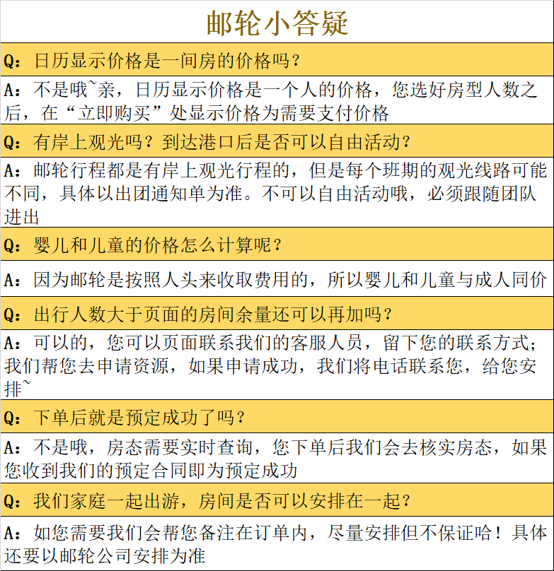 4、邮轮行程中所列航班号、岸上观光行程内容及邮轮抵离时间仅供参考,请以给您的确认出团通知书为准,严格遵守时间结点集合,因游客自身原因导致误机、误船,产生必要损失由游客自行承担;