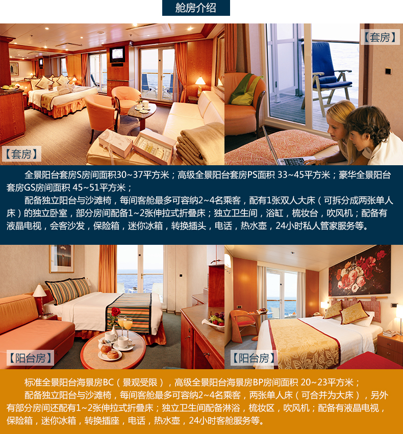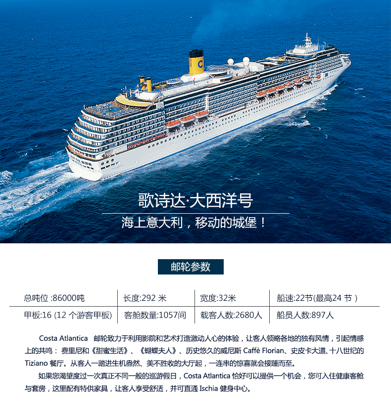 1、歌诗达“大西洋号”所选客舱住宿4晚;