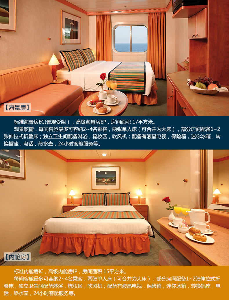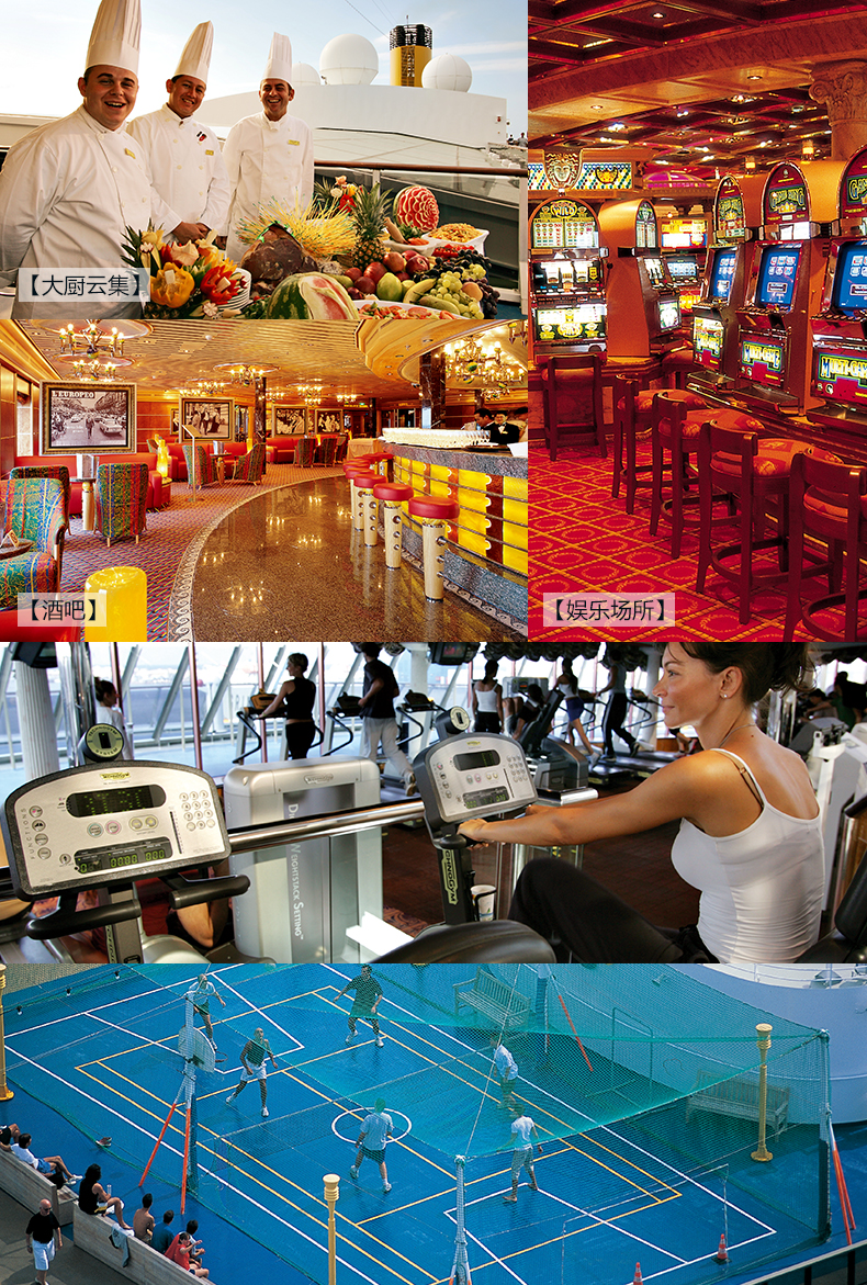 3、船上收费:含酒精类饮料、酒类、酒吧、咖啡厅、部分收费餐厅、电话费、收费电视节目、水疗(SPA)按摩、商店购物、美容美发、洗衣、医疗中心等;