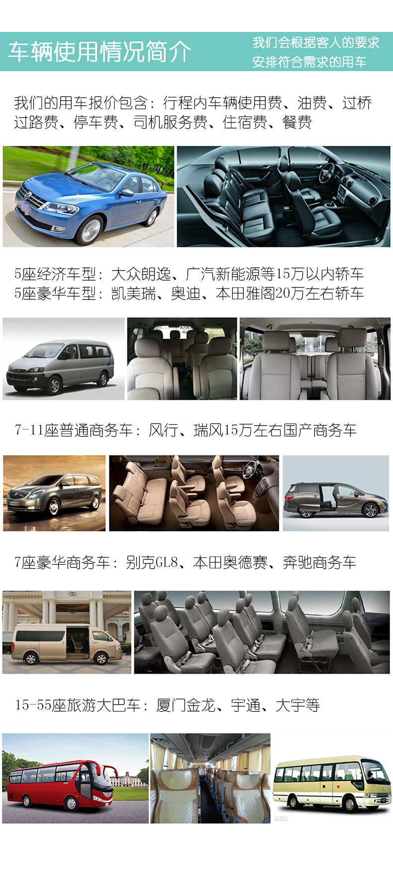 温馨提示:包车实际价格以游客具体用车的车型以及旅游线路核算,准确价格请咨询客服。