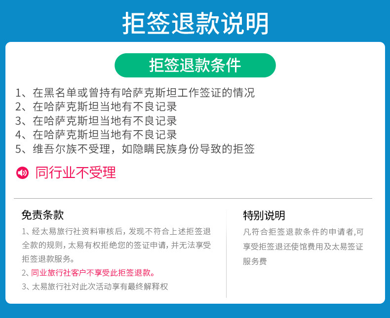 1、我公司提供的是签证辅助服务。阁下提供的资料必須保证真实和有效,否则严重影响阁下签证出签率。签证发放是领馆对申请人的特许,而非申请人权利,签证的发放或拒绝是领馆的主权行为,不容争议。阁下是否可以成功申请到签证,取决于相关国家领馆签证官对阁下直接审核结果,而非我司原因导致。若最终发生阁下被拒签的状况,阁下应自然接受此结果,我司所收取的签证费和服务费用均不退还,同时阁下亦承诺放弃追究我司的任何责任。特别提示:交易发生即为阁下同意并确认此条款。