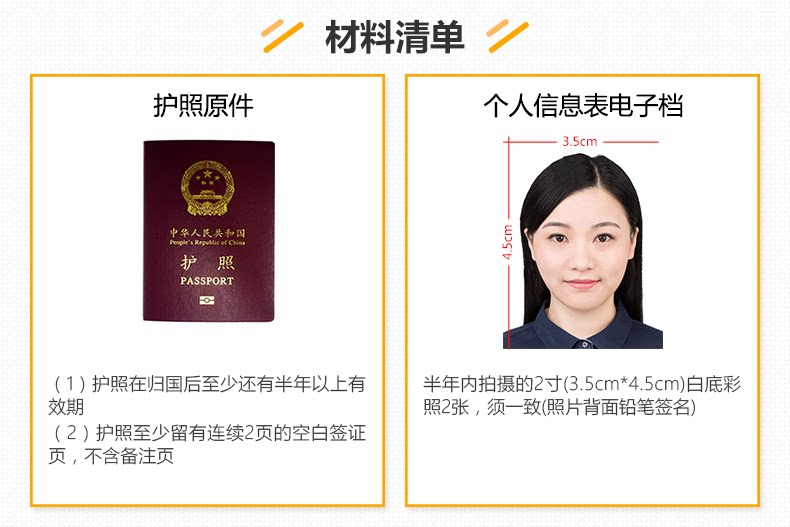 x1 | (1)护照完整无破损、无水渍; (2)护照在归国后至少还有半年以上有效期,G开头的护照末页需本人中文签名;至少有三页完整的空白签证页,不包含备注页。 | 查看样图 |