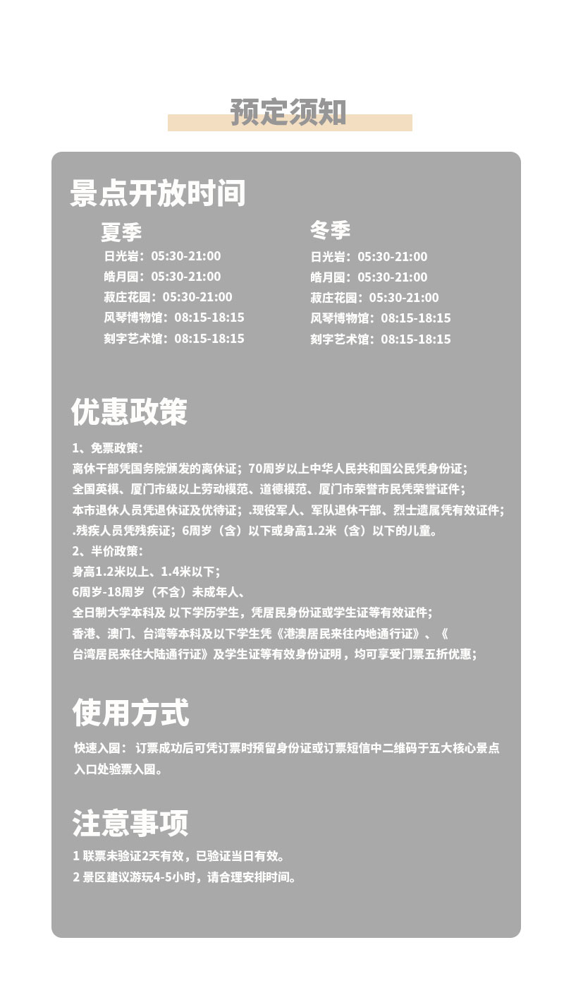 8.由于联票所含景点较多,预计游玩时间需要4-6小时,请您把握好各景点开闭园时间进行游览;过期不退