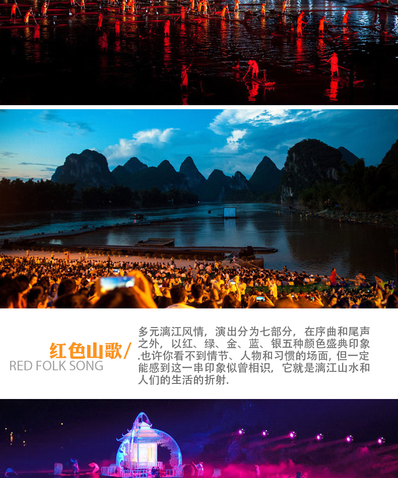 《印象·刘三姐》《印象•刘三姐》是由我国著名导演张艺谋等人导演,国家一级编剧梅帅元参与编剧创作,历时五年半努力制作完成的史诗性巨作。 《印象·刘三姐》在由方圆两公里漓江水域、12座背景山峰、广袤无际的天穹构成的世界最大山水实景剧场,演出以“印象刘三姐”为总题,在红色、白...