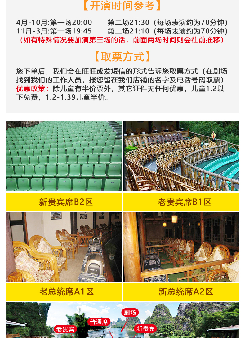 每天演出场次数和具体开演时间会根据人数当天最终确认,以短信通知为准,节假日暑期不能指定场次;淡季基本只演出一场,如果订了第二场,景区当天通知只开演一场,我们会第一时间通知您,可以帮您改成第一场;平日可指定场次,我们会尽量为您安排,如果无法满足场次要求我们也会第一时间通知您与您协商!
