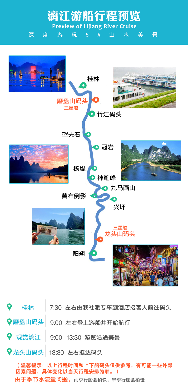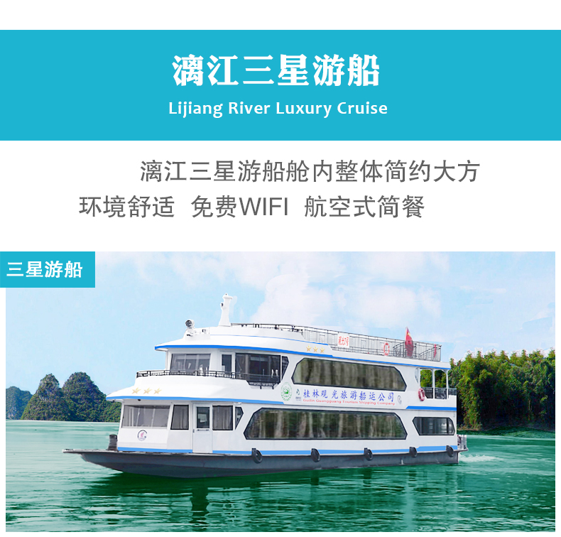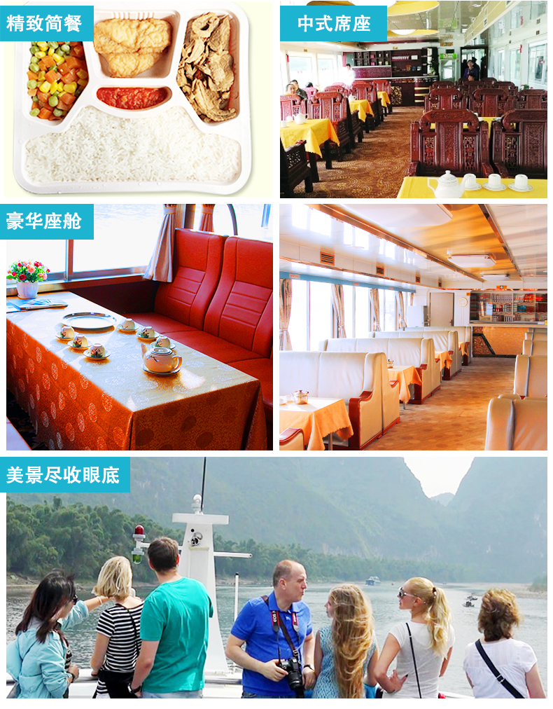 3、游船分上下舱,舱位随机安排不能指定,默认是下舱,含桂林市区内酒店接送到码头,如要升级舱位以及其他服务的请咨询客服进行调整补差!