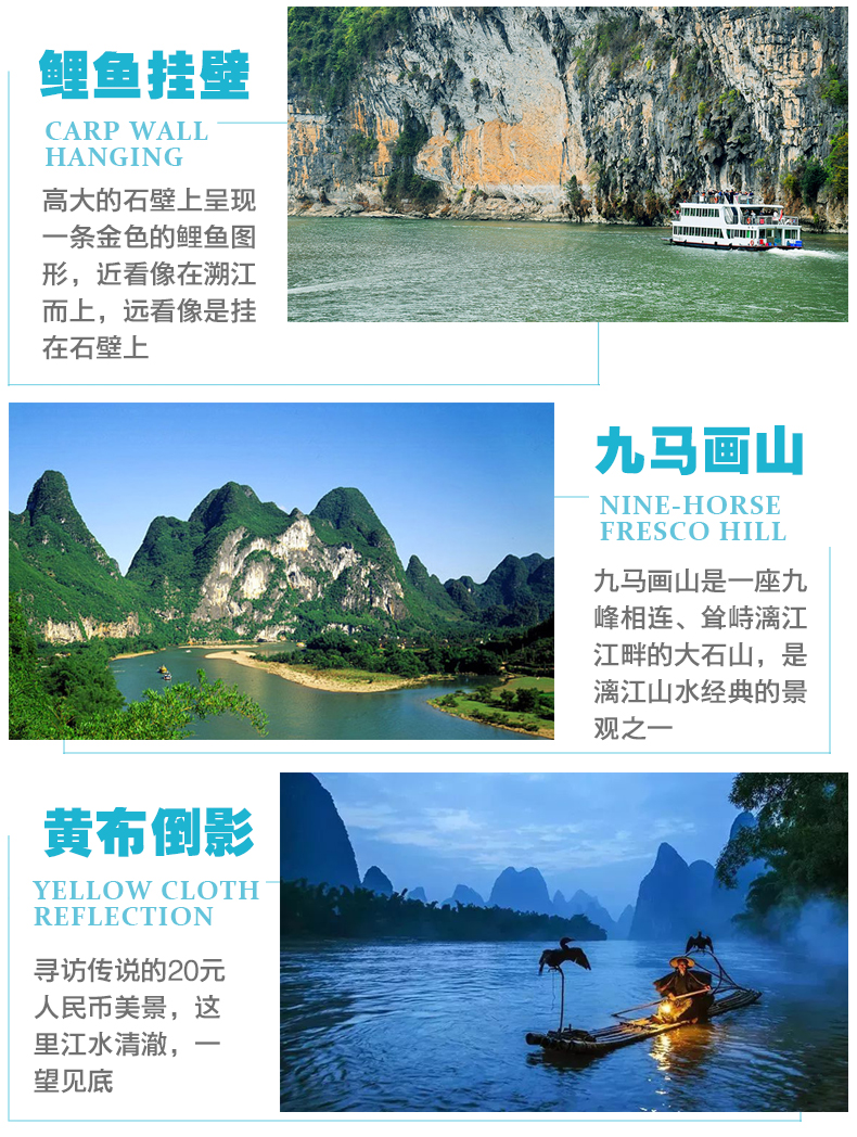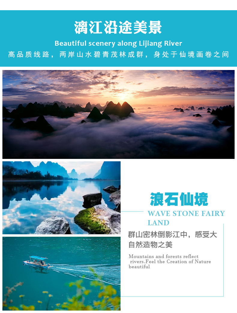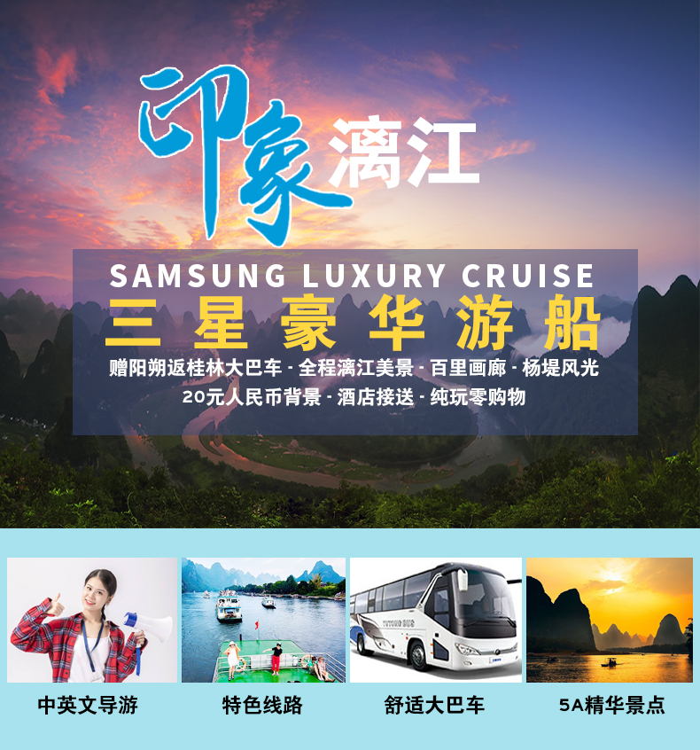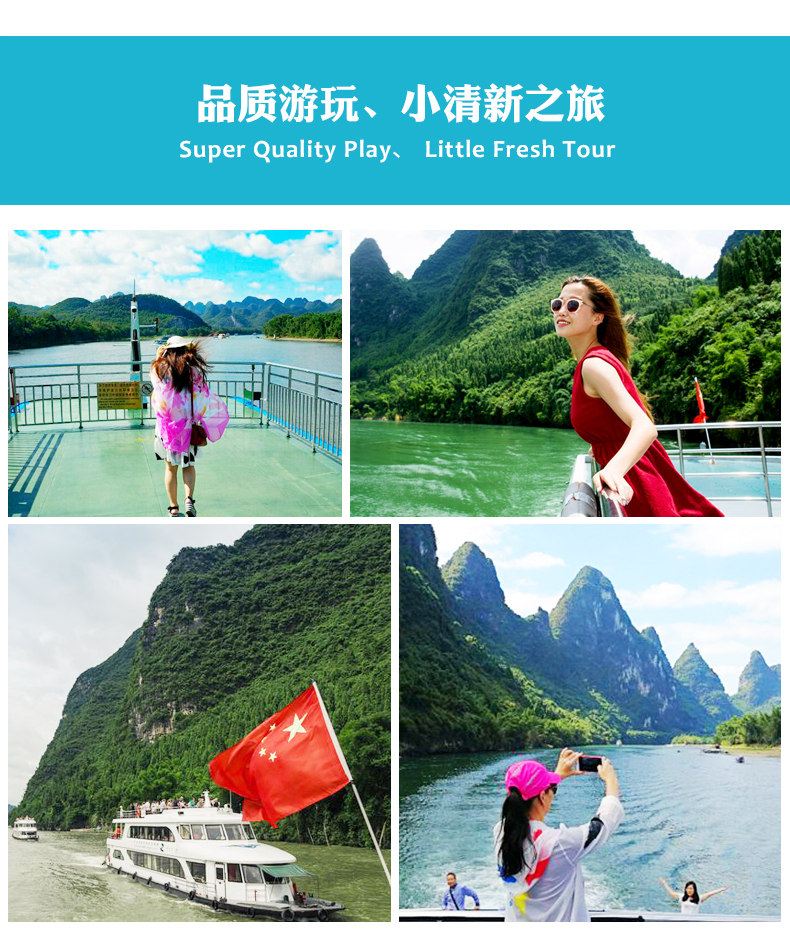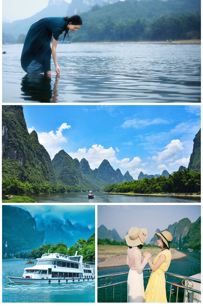 行程升级:漓江三星船、四星船、明星号、盛景号、骏达号,也可以升级下午去银子岩,或晚上游览桂林千古情或印象刘三姐,高性价比升级,如需要请咨询客服协商!