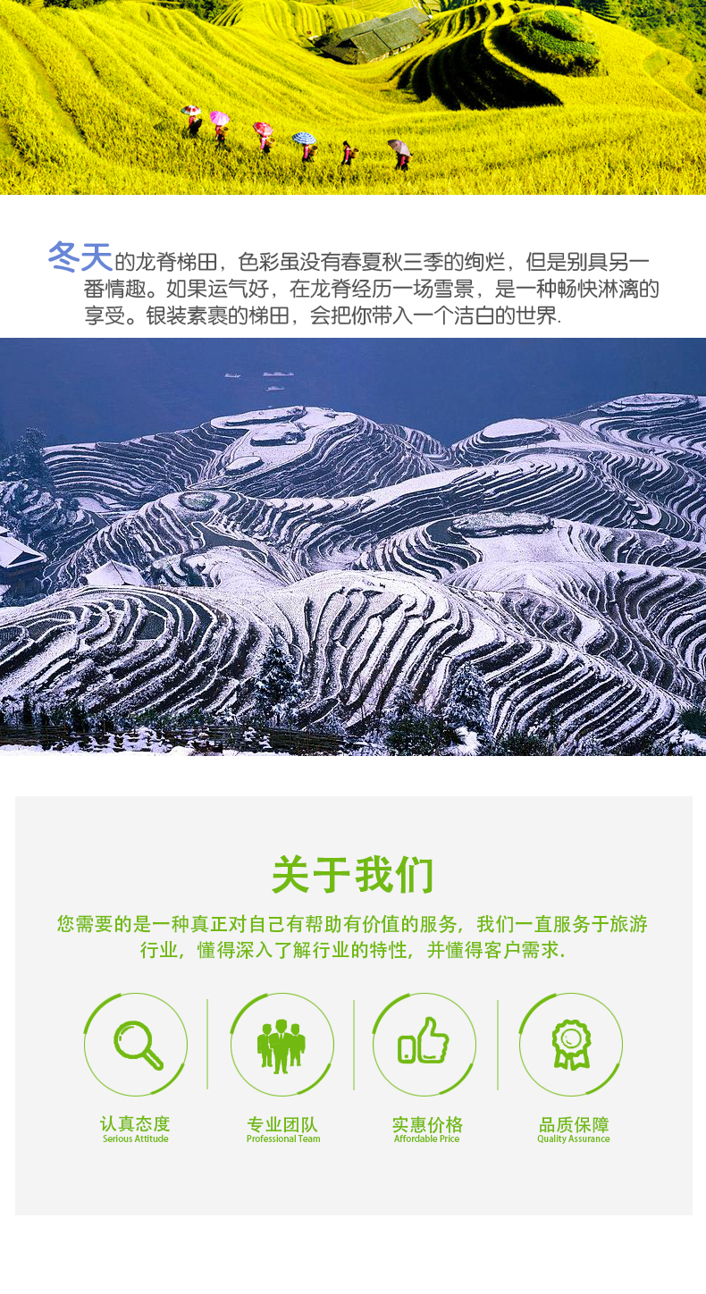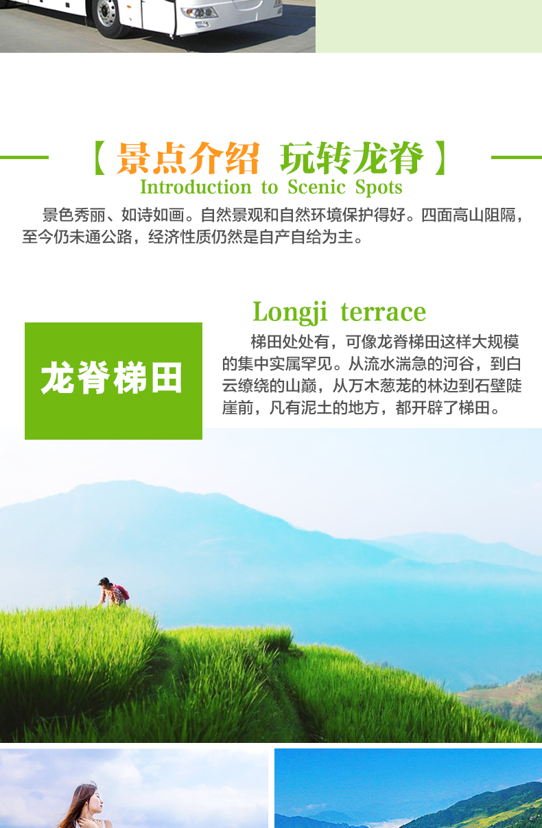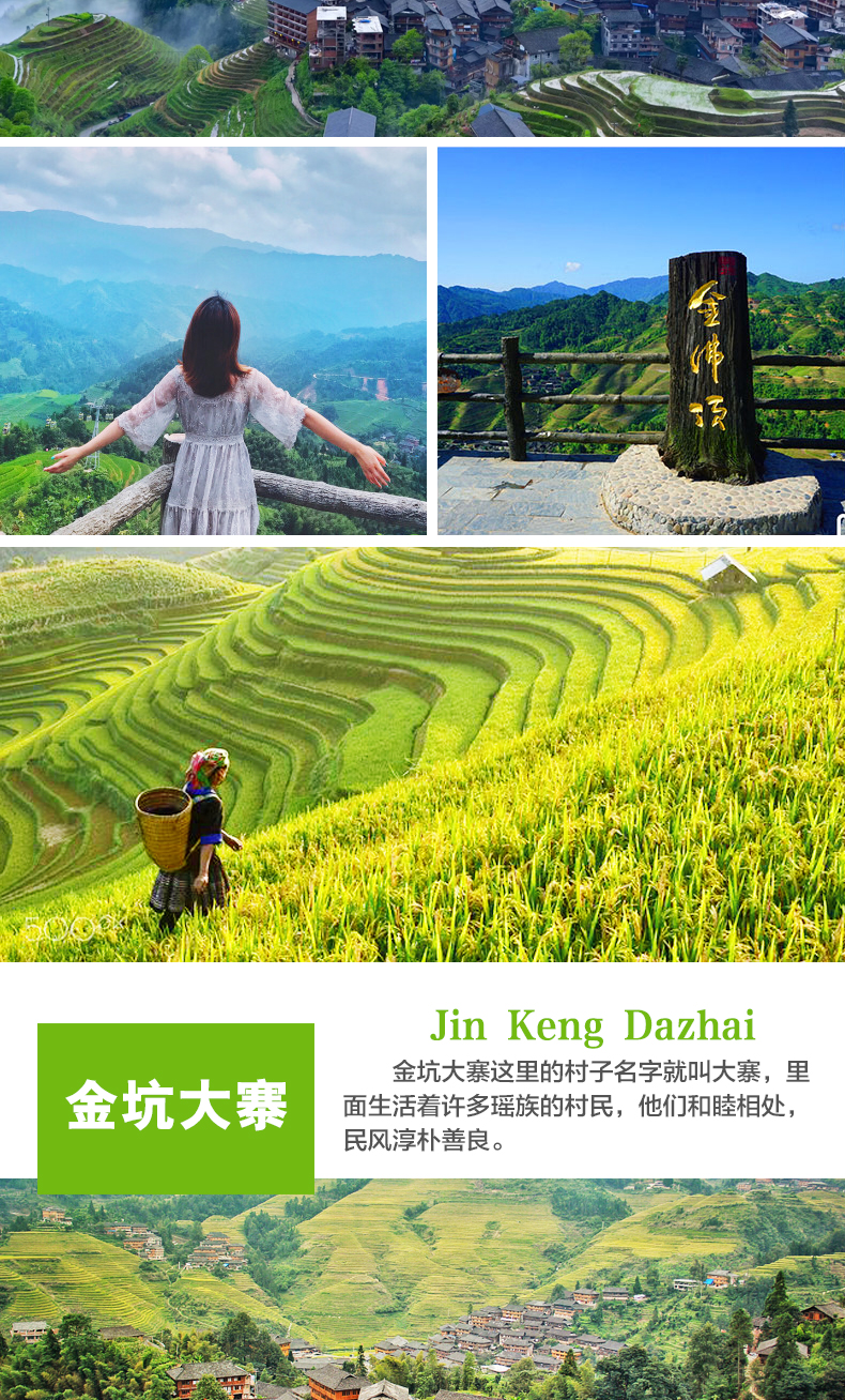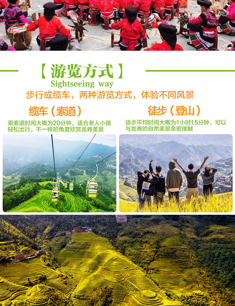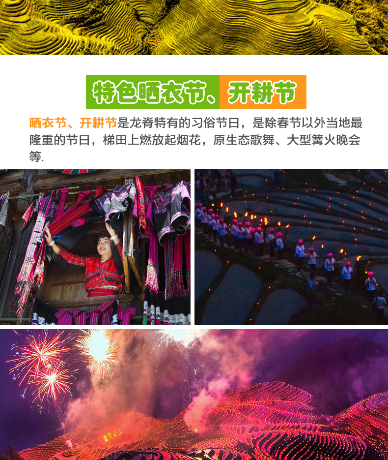 特殊情况说明:龙脊如遇道路堵车十分严重时间会延误,使得到达或返程无法确定,特别节假日如有当日赶火车、动车、飞机返程的游客,请自行按排好时间。我们不承担游客因此误机或耽误行程的损失,还敬请理解。另因堵车造成的耽误行程和坐车时间,我们能保证留好位置,但因合作方规定,不允许退款