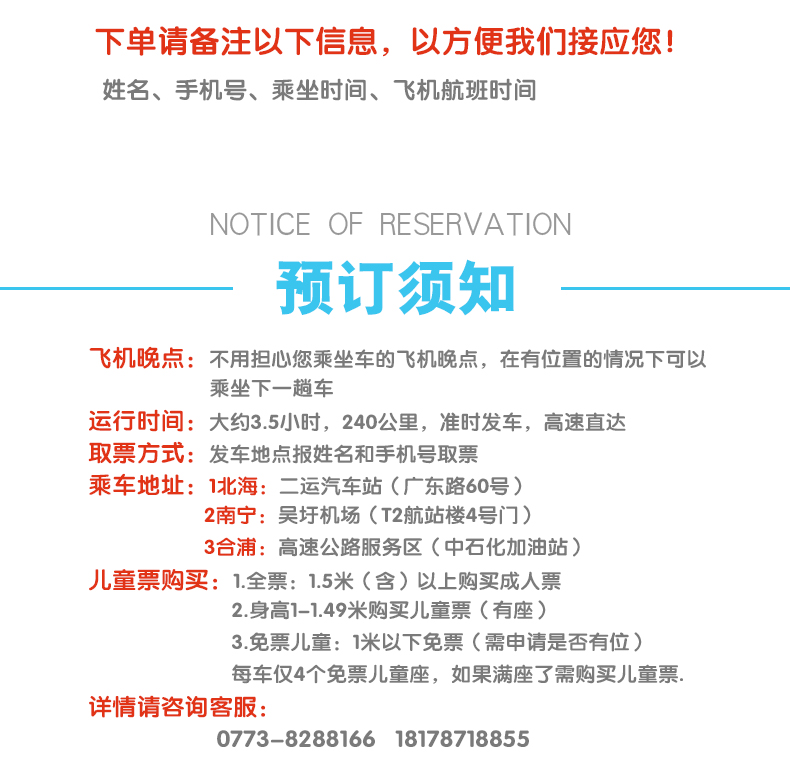 1、为了您的顺利出行,订票前请咨询客服,拍下时请备注好您的姓名、人数、联系电话、预定日期、乘车班次和航班号