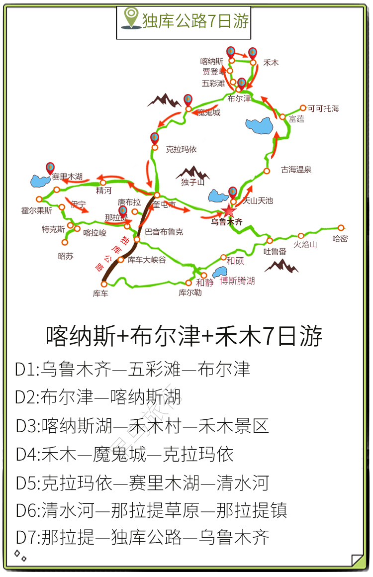 不可抗力:因独库公路通行受季节天气影响较大,在独库公路封闭管制期间,我们将绕路返回乌鲁木齐,车程和时间均会增加,但不再向游客多收费(此项不作为赔付条件,请谅解!)