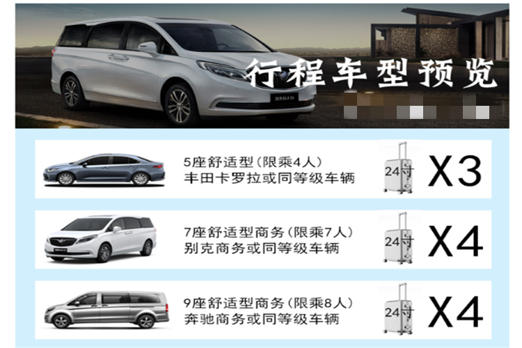 旅游旺季请提前询问车辆情况5坐车一般为10-20万随机车型,7座一般为瑞风、上汽大通、别克GL8或奔驰商务