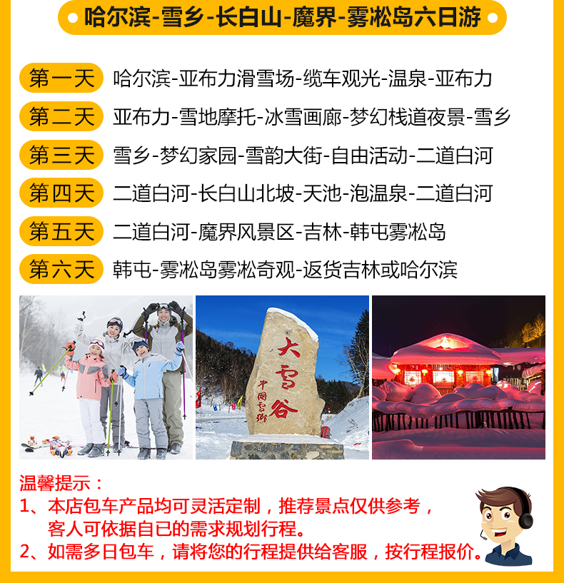 东北旅游用车资源匮乏,旺季及春节等价格变动较大,请大家下单前务必咨询客服小二确定报价哦!自行下单无效!请见谅!