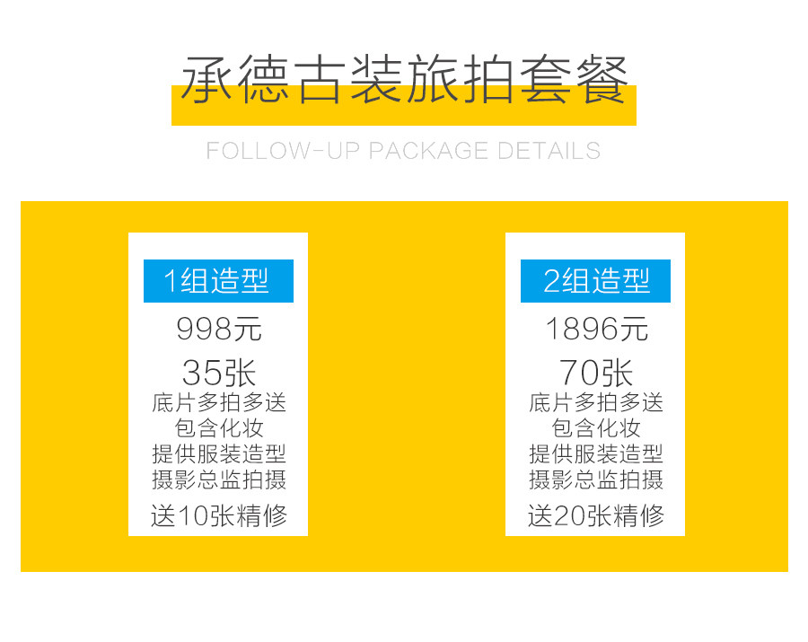底片:1组造型古装旅拍:底片不少于35张;2组造型古装旅拍:底片不少于70张;多拍多送,底片全送