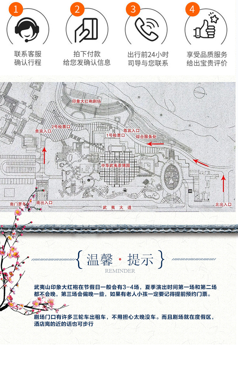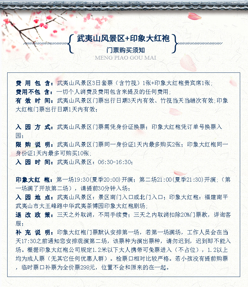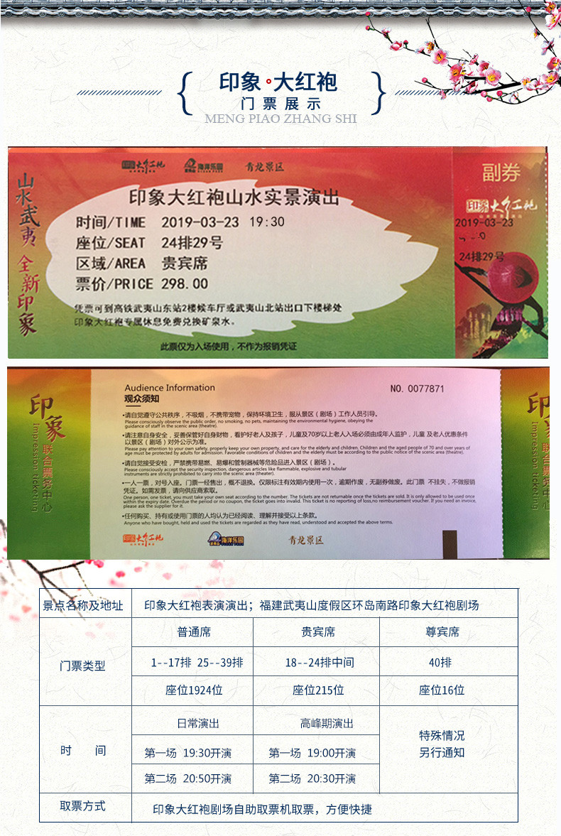 3、印象大红袍演出:入园当天凭手机和订单号到武夷山印象剧场南门的自助取票机取票;