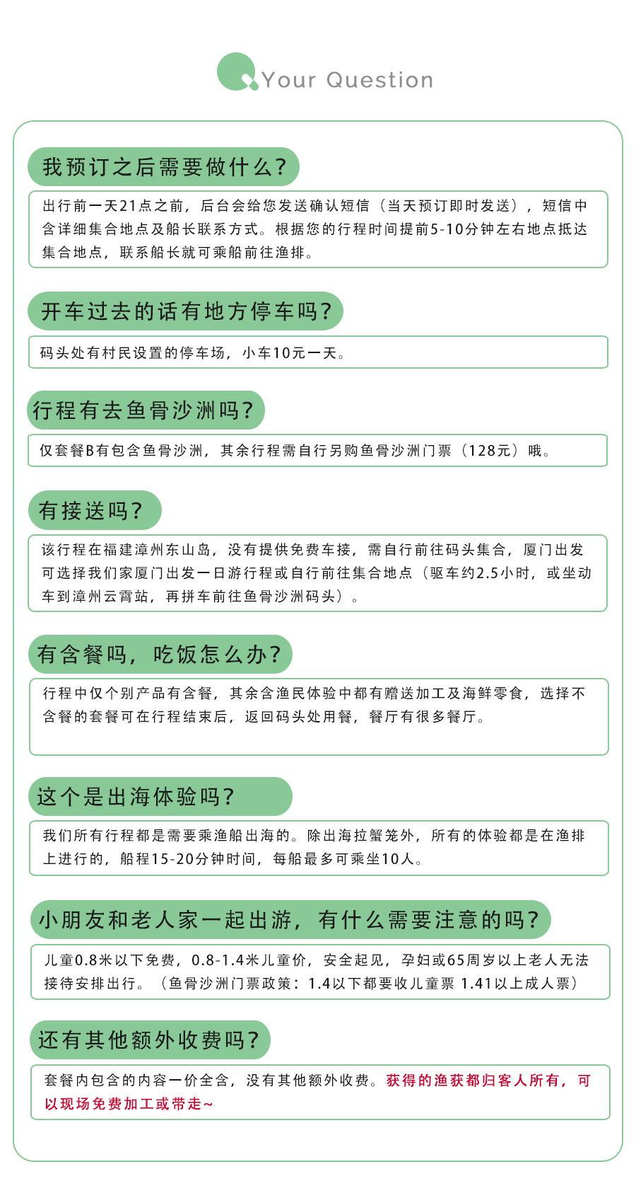 项目涉及出海活动,本着安全第一的原则,工作人员会根据当地海浪/水温/水质进行二次评估,如当天水域条件不符合出海,随时会有取消的风险,届时会第一时间进行通知以便客人调整行程,同时为客人处理全额退款,已产生的保险、食材、船只等费用无需客人承担。*因天气等不可抗拒因素造成行程改期、退订等情况、不做另外赔偿。