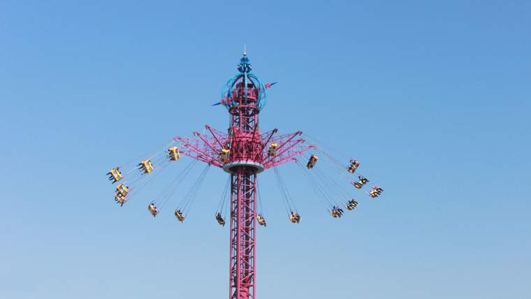 从37.8米的高处如流星般俯冲直下,匪夷所思的流星轨迹,倒挂着轨道上的极速飞车,时而感到高速下落、时而感到空中飞翔,360度空中翻腾,让人忍不住畅快淋漓的高声尖叫