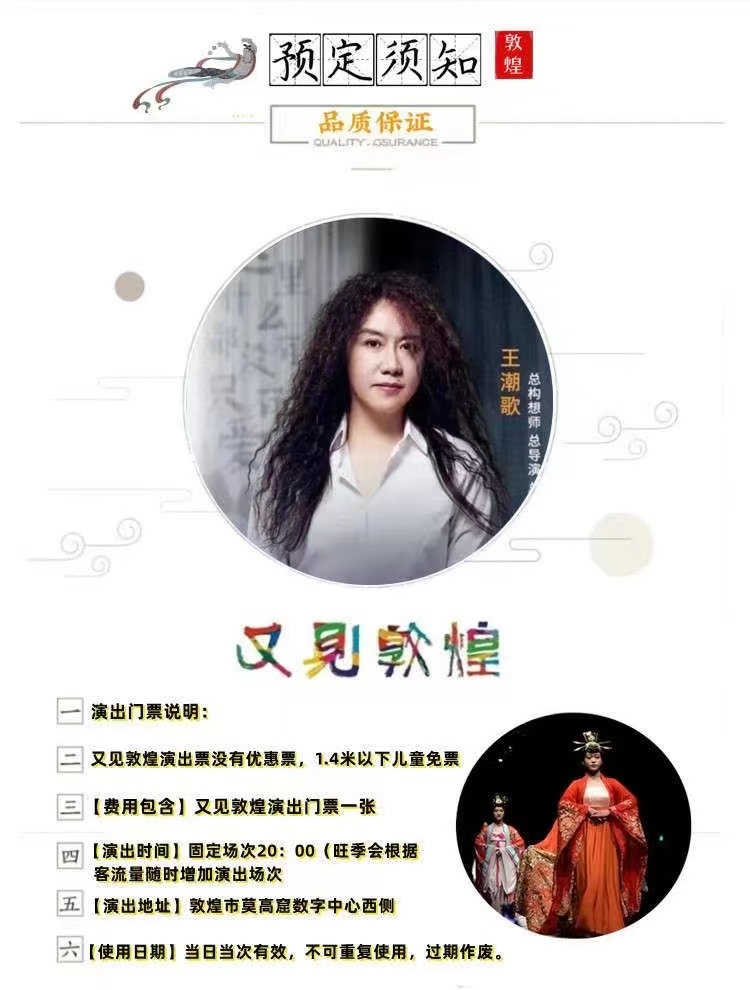 1.《入场方式》无需接送服务的,工作人员将在看演出当日会和您联系,将门票兑换码发送至您预订时预留的手机号码上,凭兑换短信在敦煌又见敦煌售票窗口兑换纸质门票后入场观演;或与您电话沟通后,沟通取票或送票方式。