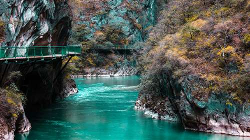 4.峡谷区是景区的精华所在,这里沿着香格里拉大峡谷共有多条支峡,目前游客可以游玩的有通天峡和香格里拉大峡谷两处。 香格里拉大峡谷非常幽深,其中河流青绿湍急、周围树木茂密,景色壮丽,谷内有5公里栈道,游客沿着栈道步行参观即可(大约1小时)。 到达栈道终点后可以乘车出谷前往通天峡,也可以选择在幽深美丽的峡谷里一路漂流而下,到达二号码头后乘车前往通天峡。 通天峡谷内有趣的是700米的悬空栈道,走在上面即能欣赏到优美的景观,又可以体验到刺激的感觉。