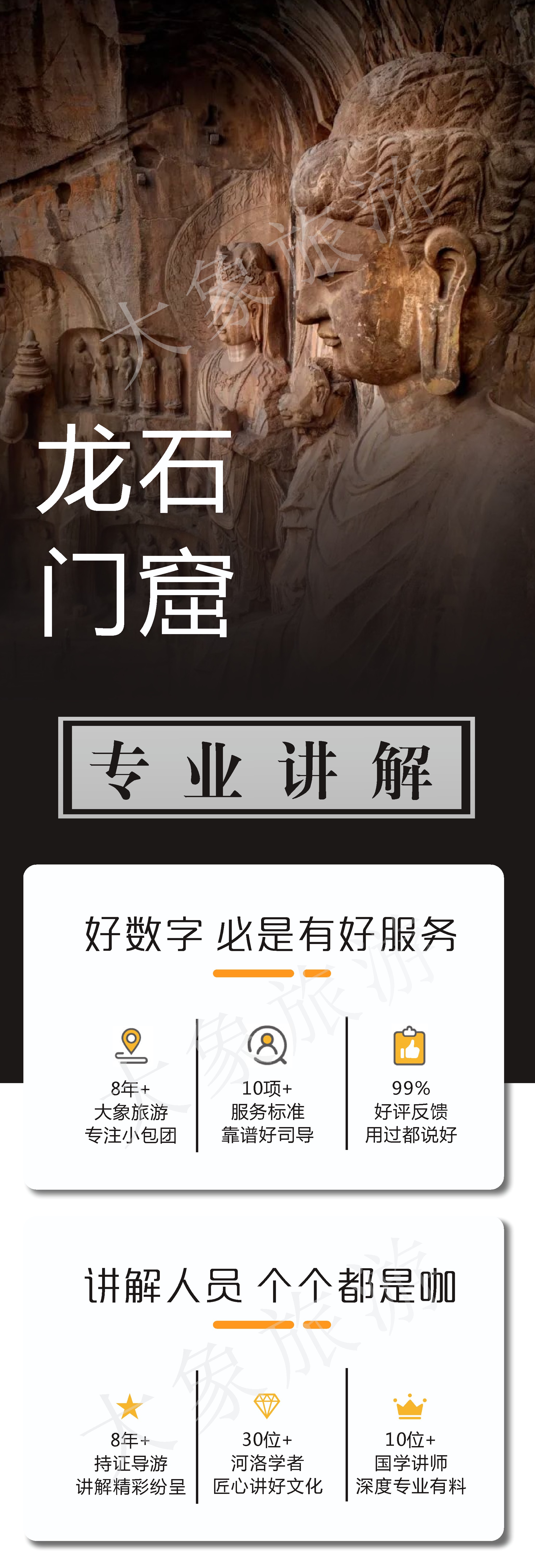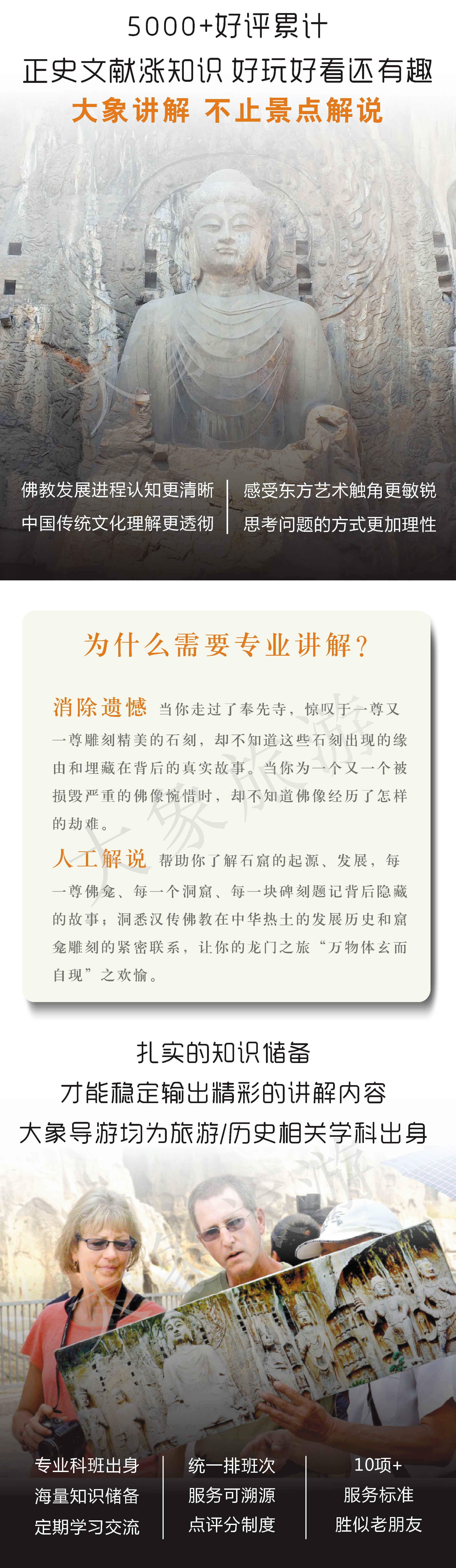 8、如遇重大接待、流量过大、恶劣天气、所选场次少于3人等因素可能需要根据实际情况调整场次。9、龙门石窟景区有2个服务区(均包含游客中心+票务中心+停车场),东北服务区抵达检票口需乘坐电瓶车,10元/位需自理,西北服务区抵达检票口需步行800米(途径龙门古街)。