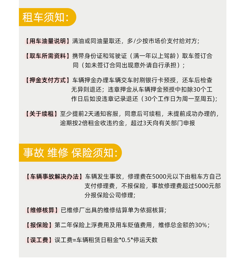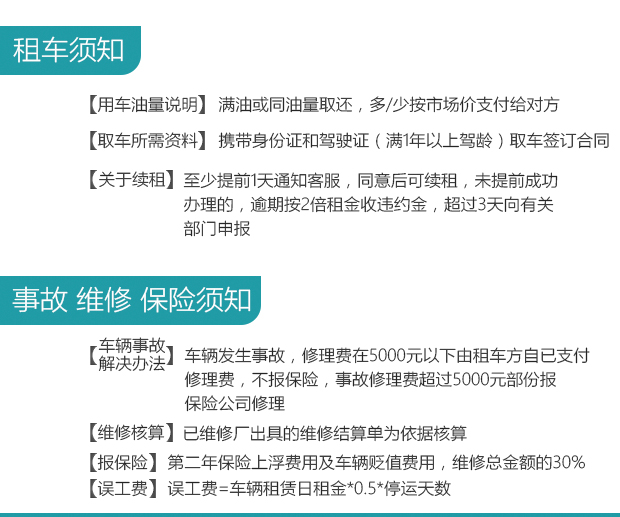 6. 非车辆自身原因造成的故障,车辆在保险公司及门店定损后进行维修,承租方需要先行垫付费用,保险公司理赔后,扣除您须承担的费用后余额将退回给您;