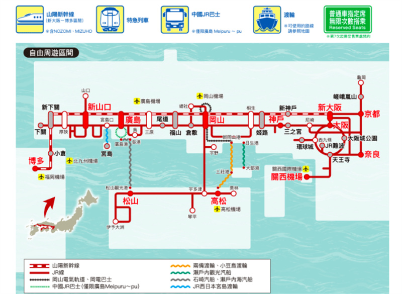 - 连续 7 日无限次搭乘指定列车,适用大坂、山口、广岛、爱媛、香川与冈山等地