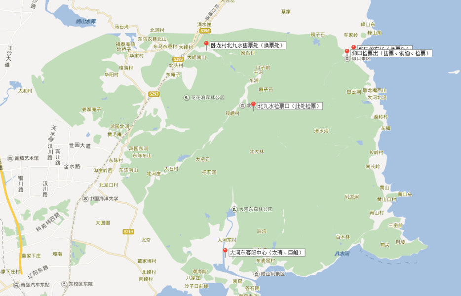北九水风景区有多个验票地点,这里要着重介绍的验票地点是卧龙村停车场北九水售票处。这里是北九水风景区的交通枢纽中心,青岛市区的团队大巴车,各位的私家车都可以免费停在这个停车场,而且这里是绝大部分公交车的终点站。购票后乘坐景区内部的环山车进入内九水游览。