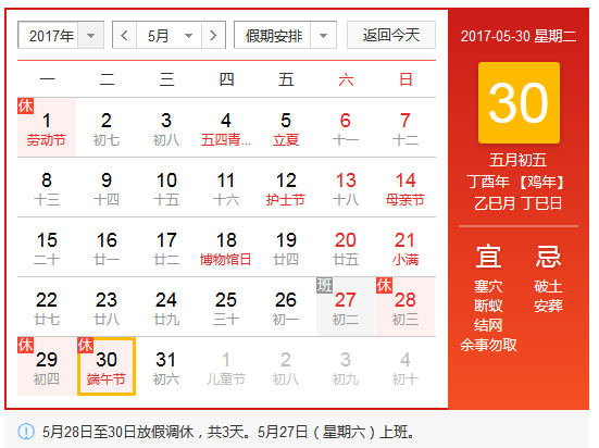 今年端午节放假时间为5月28日-30日,按照时间计算,端午节火车票预售期正是五一假期这三天(有木有觉得火车票撞上了)!!!