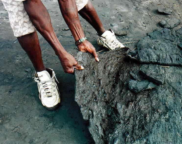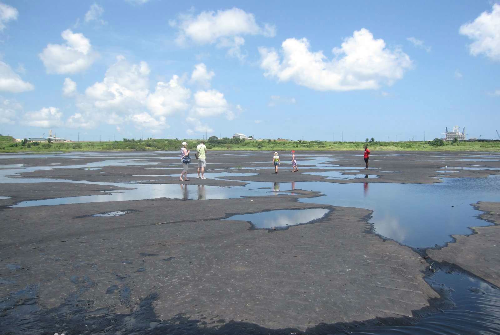 离岸边远了,沥青湖面上没了尘土,这才露出黑亮的本色。湖面总有一汪一汪的积水,杂陈着黑色的气泡孔,深一点的水里,会有一串串的气泡往上冒,表明下面仍有活跃的地质运动。有的水很清,大多数却有些浑浊的黄绿色。导游会告诉你,这是含有硫磺和其他矿物质的水,对皮肤尤其好。在有的地段,导游还会拉着你的手伸进去感受一下,泡过以后的手,的确非常舒服。但有的地方却不能碰,硫磺含量太高,会把皮肤烧坏。