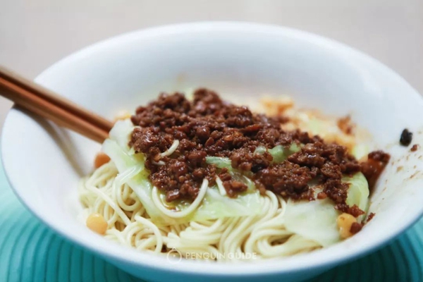 小面又称豌杂炸酱面,豌豆入骨头汤小火慢炖,直到软糯出泥,五花肉剁泥,和甜面酱炒至金黄,肉酱有细碎的颗粒感,豌豆又煮得缠绵,吃起来满嘴都是酱香和豆香。重庆小面标配唯怡豆奶,绝对解辣好帮手。