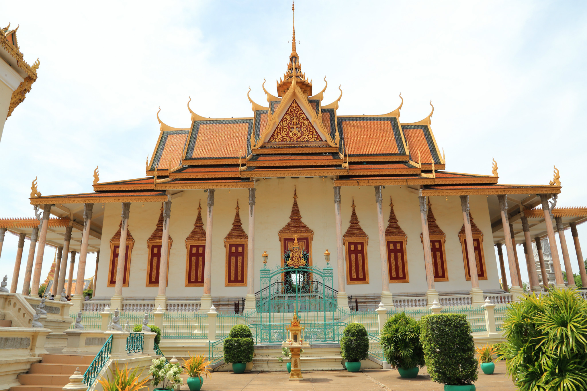 金边皇宫也称四臂湾大王宫,因位于上湄公河、洞里萨河、下湄公河与巴萨河的交汇处而得名,是柬埔寨国王的皇宫。王宫的建筑具有高棉传统建筑风格和宗教色彩,宫殿均有尖塔,代表繁荣;殿身涂以黄、白两色,黄色代表佛教,白色代表婆罗门教。