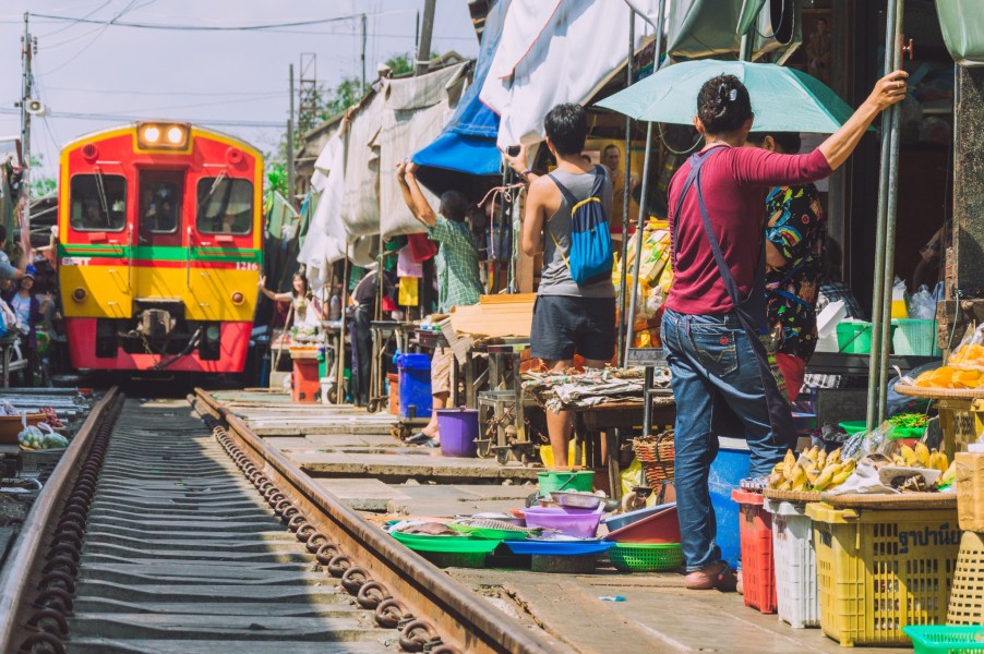 世界上应该再没有一个市场是摆在火车铁轨上了,美功铁路市场就是这样一个神奇的存在,美功铁道市场的摊位都是沿着铁道摆放,有许多便宜的水果和新鲜蔬菜。市场里面人头攒动,川流不息,横跨火车轨道,每当有火车过来,火车站就会发出鸣笛警告,摊主们就会收起摊位,等火车通过。