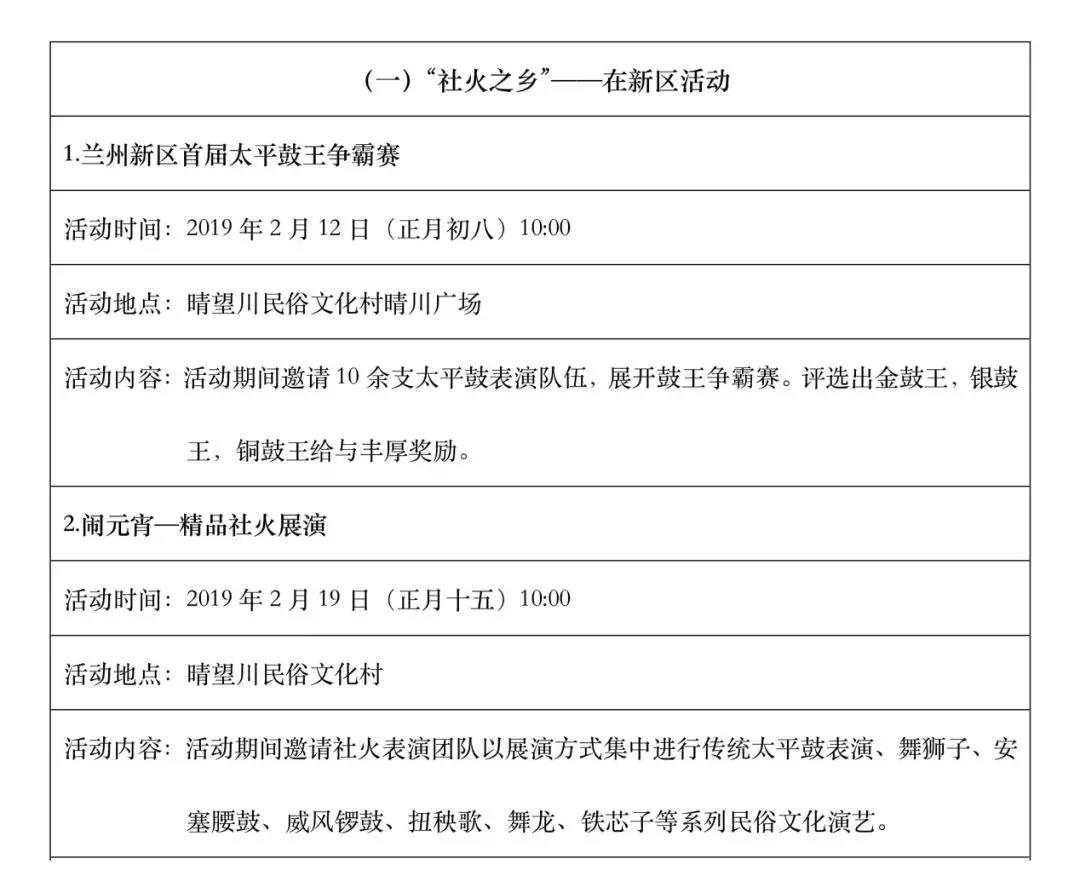 据悉,此次兰州新区“传统年,在新区”新春欢乐购年会活动,在活动期间将开展以耍社火、赏花灯、逛庙会、购年货、泡温泉为主题的五大年会活动,通过太平鼓王争霸赛、精品社火展演、各大商业综合体、酒店、景区“新春欢乐购”等多种形式,将为市民带来丰富多彩的新区年会欢乐盛宴。