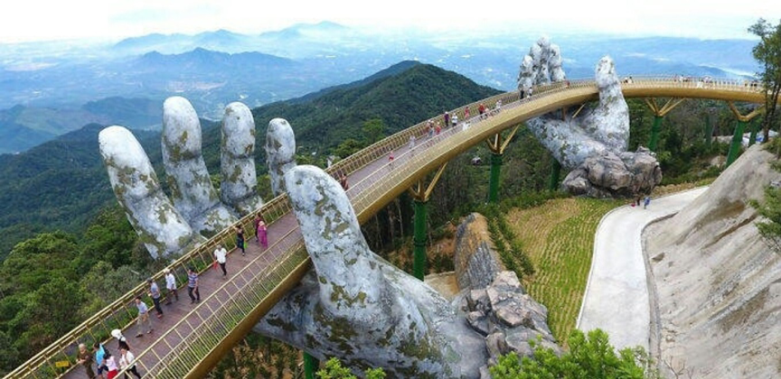 去年6月,越南岘港刚刚开放了令人震撼的黄金桥,一双巨大的佛掌在半空中托着桥体,看着远处绵延不绝的奇丽风景,仿佛行走在仙境云端。