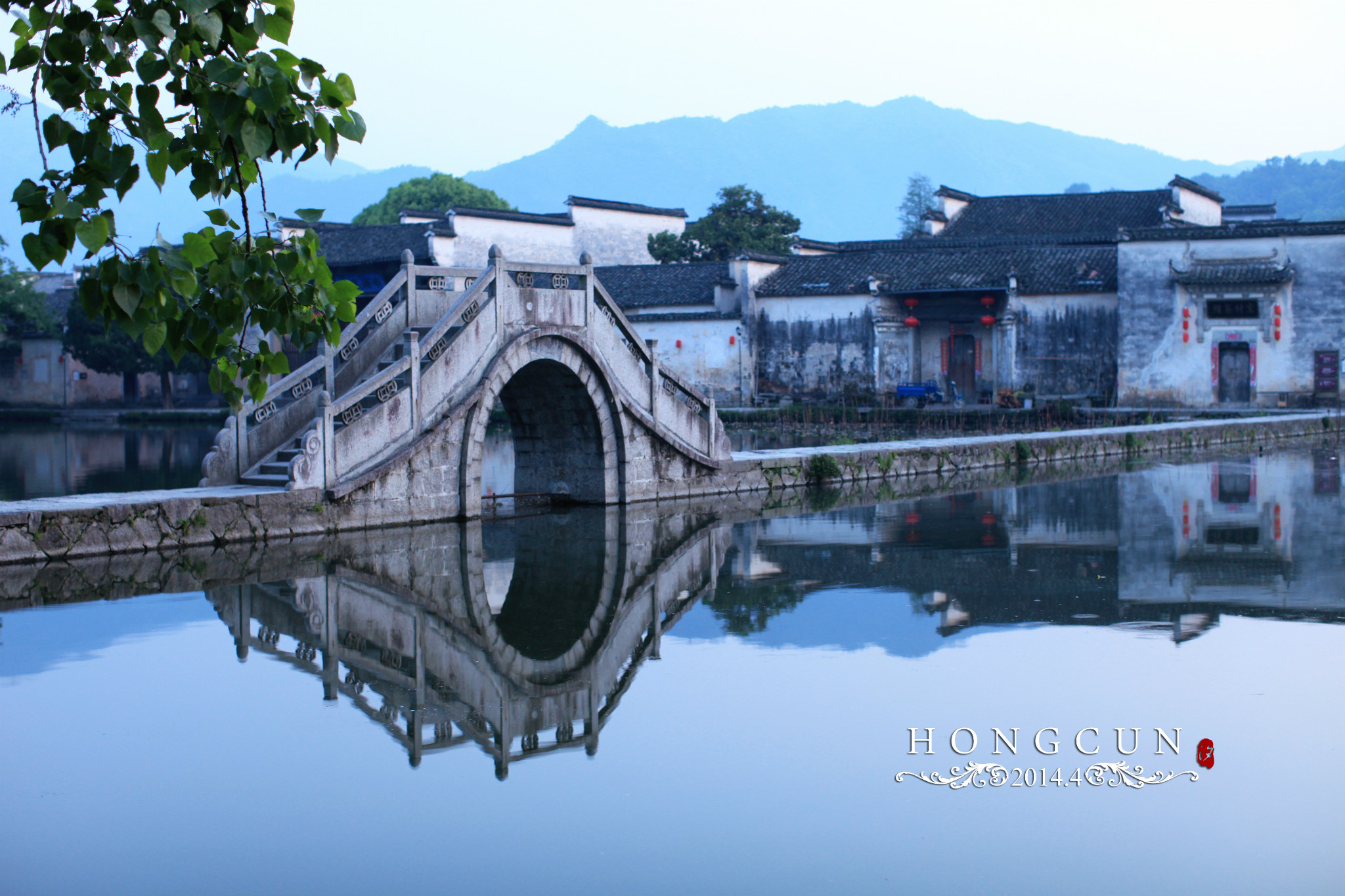 从西门入古镇,应该是最佳选择。西门口有一座桥,站在桥上北望,还有一座与你所在的桥平行的桥,桥的两侧是典型的徽派建筑。两桥大约有300米的距离,远处黄山余脉的雷岗山山峰被雨雾遮罩,呈现出较深的墨色,与这些古屋形成了鲜明的层次对比,色彩对比,意境对比。
