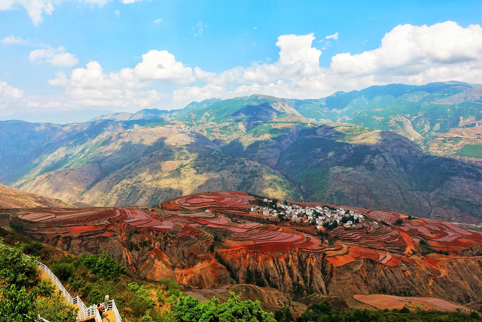 东川红土地因土壤里含铁、铝成分较多,就形成了炫目的赤红色彩。红土地景点较为分散,分为三条主要线路:西北线、东北线和南线。常规的拍摄路线为清晨在打马坎观赏,其它时间在七彩坡、锦绣田园、乐谱凹、老龙树,傍晚时分到落霞沟拍落日。