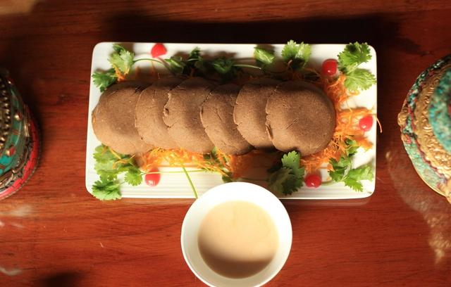 糌粑是藏族人民的主食。把青稞、豌豆炒熟,磨细成面,用酥油茶拌匀,捏成小团食用。吃糌粑很方便,可随时倒出些炒面,添上一块酥油,和上已备好的酥油茶或者热水,在木碗里捏好就可以开吃。对于习惯吃糌粑的人来说,糌粑还是很好吃的,青稞炒面的清香,因加了酥油和奶茶,还有一股奶香。