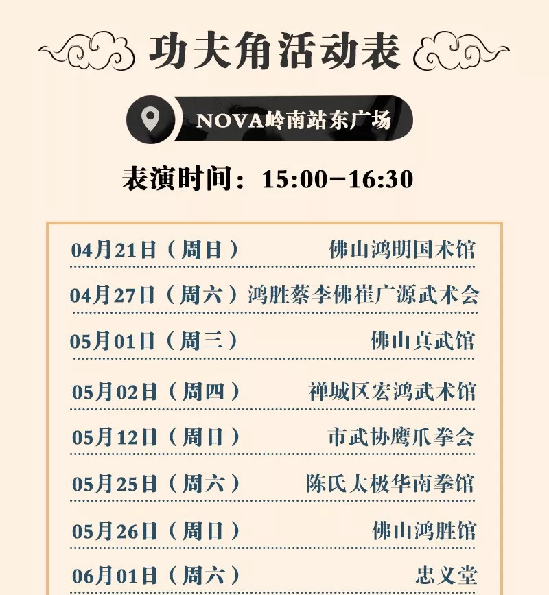 4月21日上午9:30,在NOVA岭南站-东广场举行了“佛山功夫角”的启动仪式,此次功夫角活动为期一年,逢周六日及指定日期,蔡李佛、詠春、鹰爪、太极、洪拳等多种功夫文化将在NOVA岭南站-东广场进行示范表演。