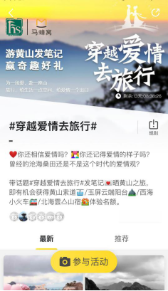 此外,在马蜂窝APP#穿越爱情去旅行#话题中,可以看到游客分享的和黄山旅游相关的精彩图片、视频和文字。一条条精美的笔记记录了黄山旖旎风光,见证了游客黄山之旅的感动与震撼。据了解,线上活动持续到8月20日结束。活动结束后,黄山景区将发放景区索道票、西海小火车、玉屏云端阳台、北海·雲亼山宿体验名额等游玩福利。