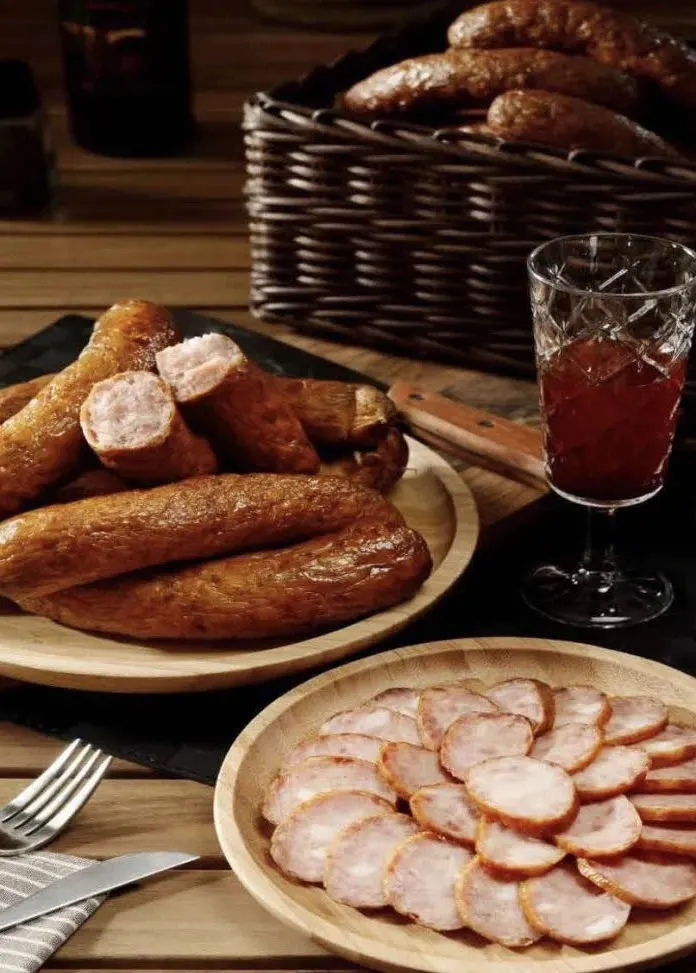 经过严格选料、古法腌制、灌肠蒸煮、两次熏烤、椴木烟熏,使其味道醇厚、鲜美,烟熏入味,蒜香袭人。