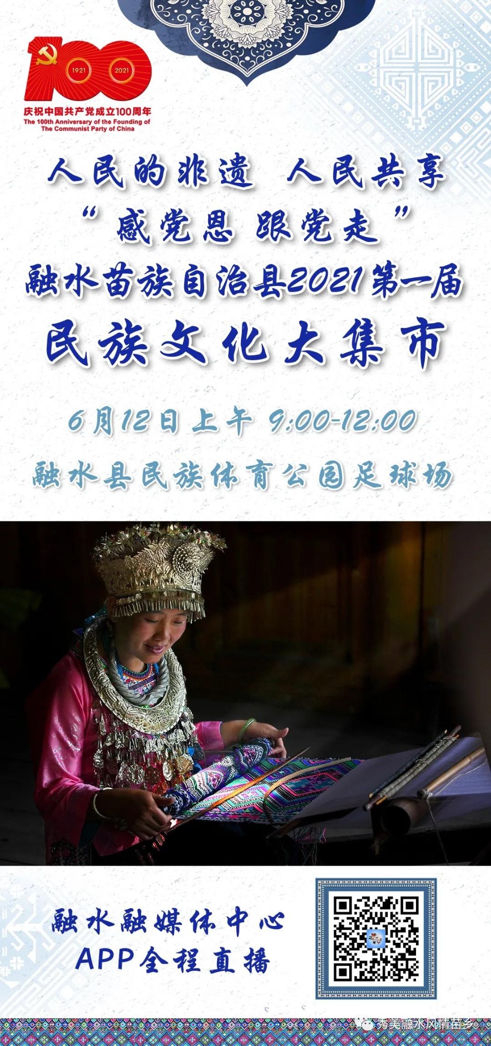 6月12日,“感党恩 跟党走”融水苗族自治县2021第一届民族文化大集市在融水民族体育公园举行。活动通过开展非遗技艺、非遗特色美食展示、非遗项目体验和销售等系列活动,展示融水优秀民族文化风采,进一步弘扬融水优秀民族文化。县委常委、宣传部部长、副县长王院忠,人大常委会副主任管翠留,县政协副主席李宛潞出席活动。