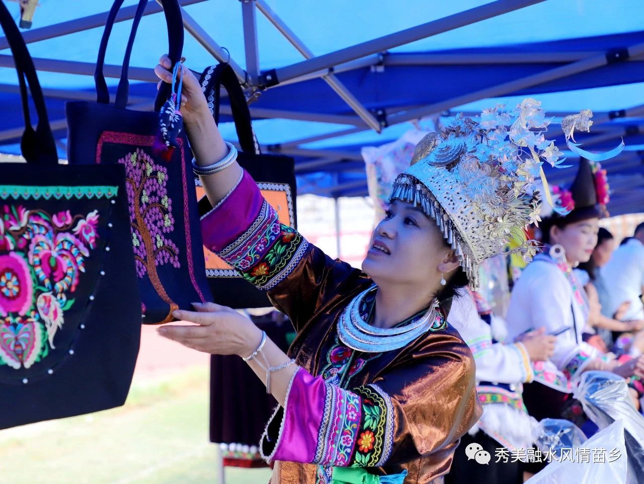 民族文化大集市上,还专门设立了非遗产品、文创产品、和特色美食等展示区,马贵兵苗族银饰工作坊、彩云苗艺染织绣非遗生活美学馆、融水县鑫辉芦笙制作有限公司等50家单位和31名非遗传承人参展,主要展品包含苗族蜡染、苗族织锦、苗族竹编、苗族银饰和本地土特产等。
