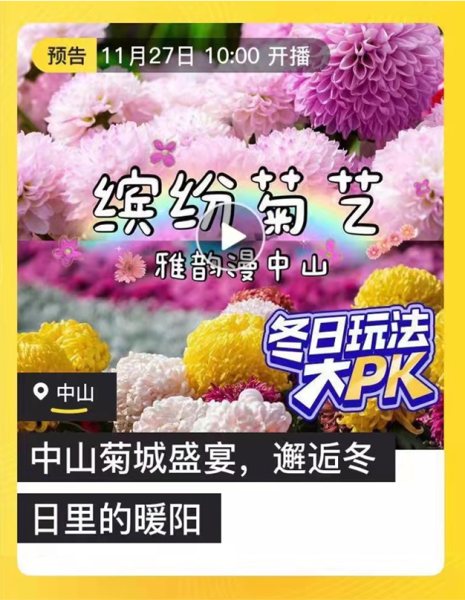 除此以外,“追逐田园野趣,品味中山新意”系列活动以时下热门的“直播云旅游”模式,结合“中山小榄菊花会”,将进行一场融合中山非遗文化、民俗风情、自然山水资源的沉浸式旅游互动视听盛宴,全力推进中山旅游复苏。