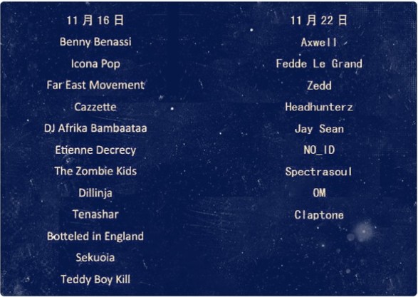 2013风暴电子音乐节时间:2013年11月16日、2013年11月22日(入场时间13:00演出时间14:00)