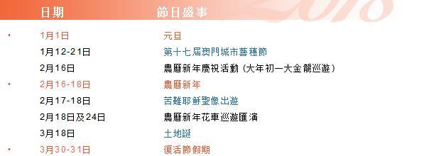 2018澳门春节放假与大陆略有不同,2月16日-18日,只有3天假期。在大年初一时将有農曆新年慶祝活動(金龙迅游),不要错过哦!