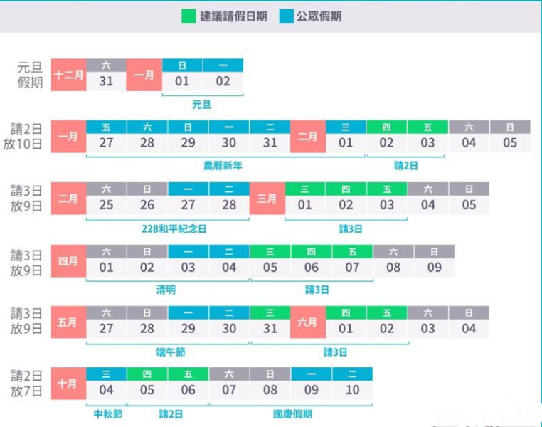 台湾和大陆在假期设置上略有不同,台湾人过的228和平纪念日、双十节,大陆都不过。遇到需要调休补班的情况,台湾的规定是放假节日遇周二或周四一律调整放假,于前一星期周六补上班。知道了台湾的放假规则,小编马上来为你列出台湾各假期的具体放假时间和调休日期。
