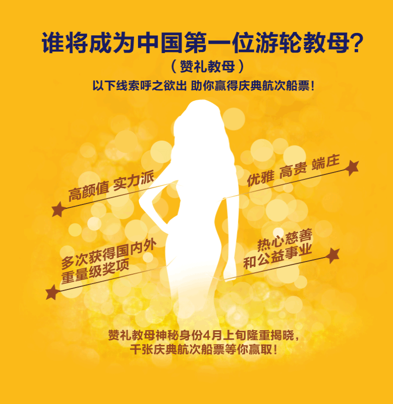 即日起至4月2日,根据线索猜“赞礼教母”,即有机会获得“皇家赞礼号”庆典船票一张
