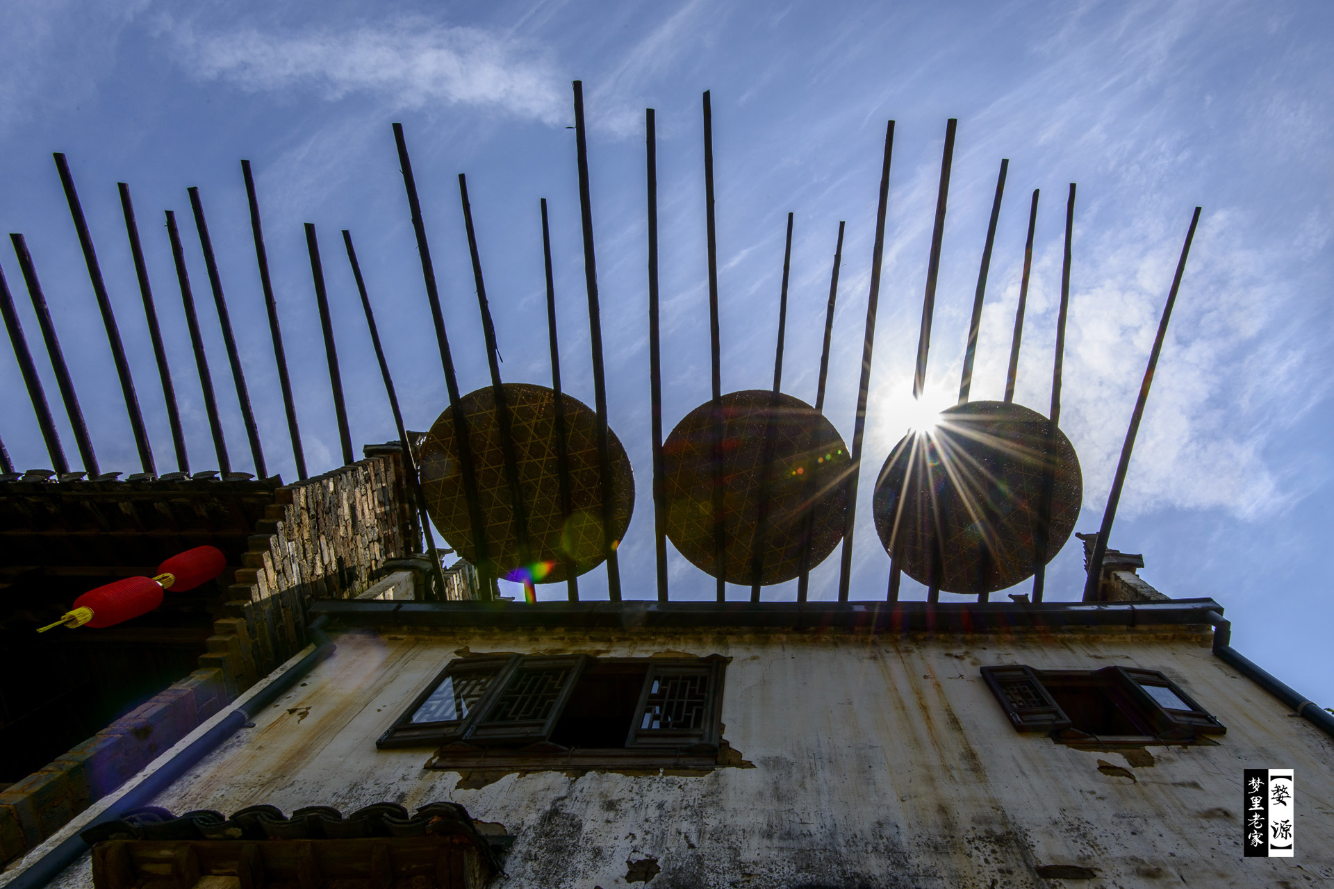 阳光透过晒秋的工具投下来,安静美好。