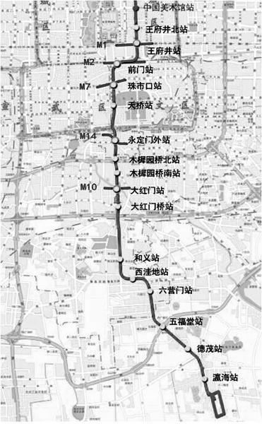 北京地铁8号线三期线路图:设置16座车站,自北向南分别为王府井北站、王府井站、前门站、珠市口站、天桥站、永定门外站、木樨园桥北站、木樨园桥南站、大红门站、大红门桥站、和义站、西洼地站、六营门站、五福堂站、徳茂站、瀛海站。北边到昌平的朱辛庄,南边到大兴的瀛海,未来全长50多公里的地铁8号线将贯通南北五环。