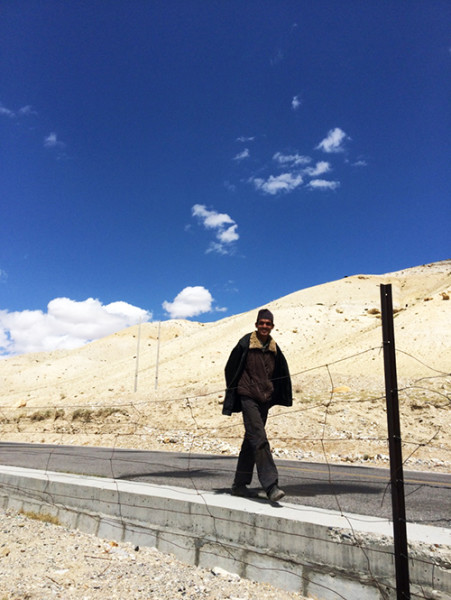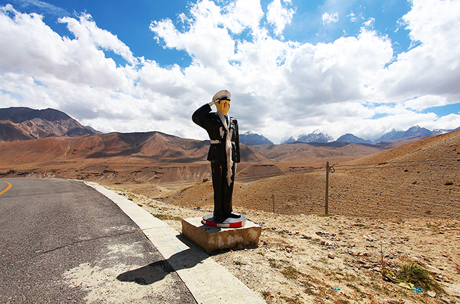 每隔一段路边就会出现一个水泥做的警察,脖子上系的哈达在风中飘,空谷风萧飒,兀立一人,想起我一朋友的口头语:太吓人了!